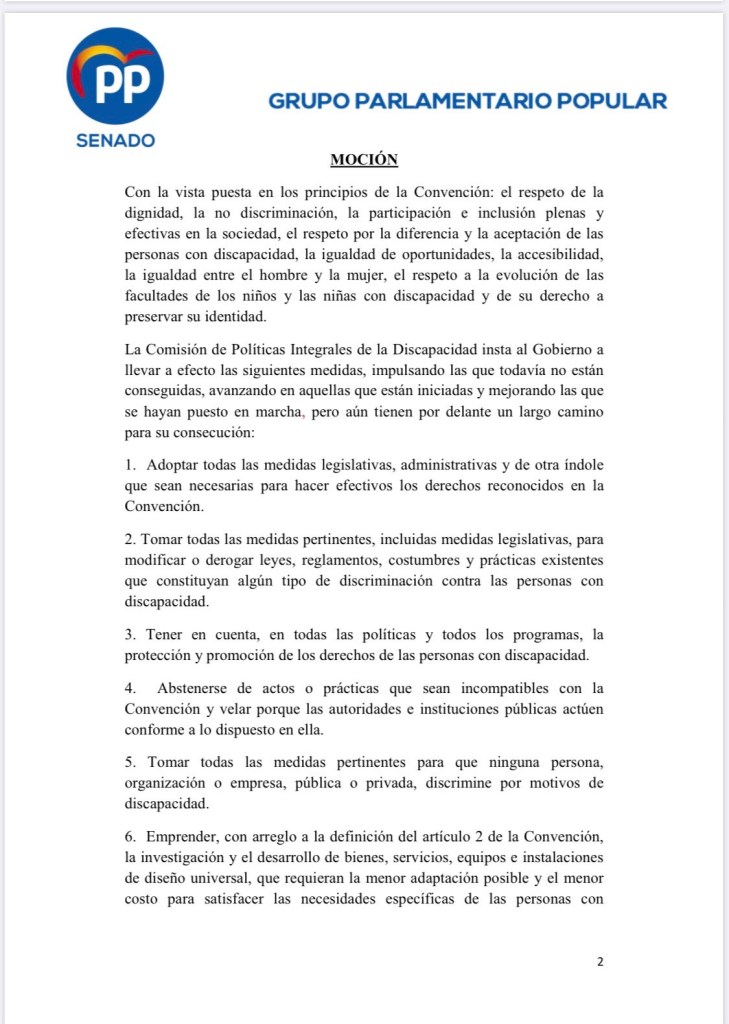 EL GRUPO PARLAMENTARIO POPULAR, a iniciativa de Doña. Violante Tomás Olivares, D. Francisco M. Bernabé Pérez y D. Juan María Vázquez Rojas, senadores por la Región de Murcia, Dña. Ana Alós López, senadora por Huesca, Dña. Ana Lourdes González García, senadora por La Rioja, Dña. Ana Camins Martínez, senadora por la Asamblea de Madrid, Dña. Verónica María Casal Míguez, senadora por A Coruña, Dña. Amaya Landín Díaz de Corcuera, senadora por Cantabria, D. Miguel Lorenzo Torres, senador por A Coruña,D. José Vicente Marí Bosó, senador por Valencia, D. David Muñoz Arbona, senador por Ceuta, D. Javier Puente Redondo, senador por Cantabria, Dña. Patricia Rodríguez Calleja, senadora por Ávila, al amparo de lo dispuesto en el artículo 177 del Reglamento de la Cámara, solicita la tramitación de la siguiente MOCIÓNante la COMISIÓN DE POLÍTICAS INTEGRALES DE LA DISCAPACIDAD.