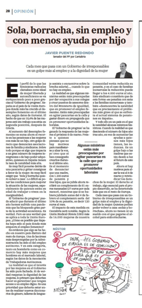 Ahora sí hay motivos para alzar la voz el 8 de Marzo y reivindicar los derechos de la mujer. El derecho al trabajo, algo esencial para el propio desarrollo, se ha deteriorado más que en el resto de Europa. Cada mes que pasa con un Gobierno de irresponsables es un golpe más al empleo y la dignidad de la mujer. Quienes pedían poder volver a casa “solas y borrachas”, ahora no tienen ni un sueldo con el que pagarse el alcohol para emborracharse.