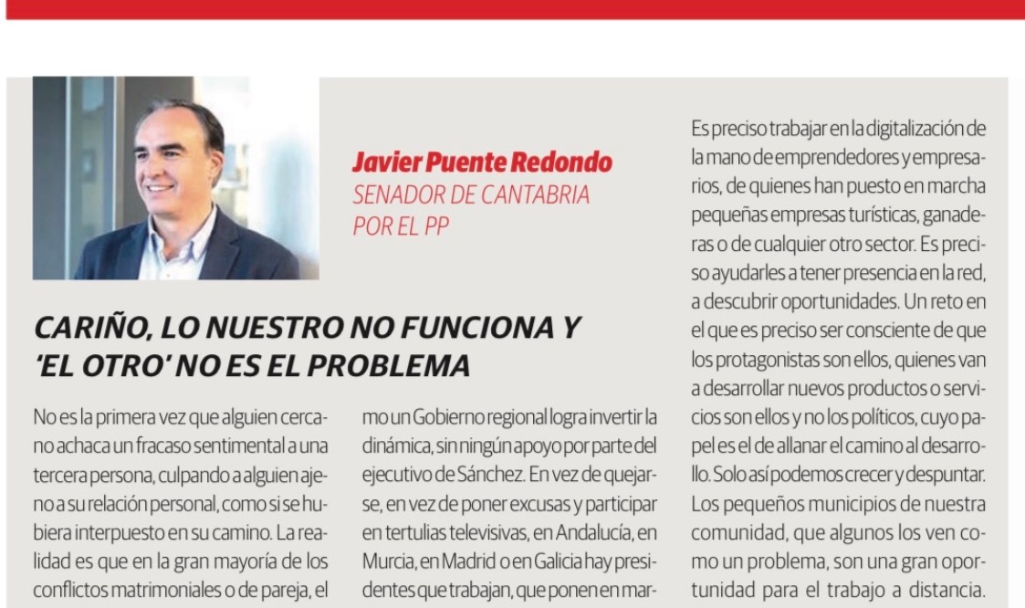 Los ciudadanos de Cantabria estan cansados de palabras vacías, de declaraciones de tertulia, de lamentos y de culpar a otros sin mirar los errores propios. Tenemos las bases para crecer y para despuntar en el futuro. Basta detectar los problemas y afrontarlos de frente. No se soluciona nada, ni los problemas de pareja, culpando ‘al otro’.