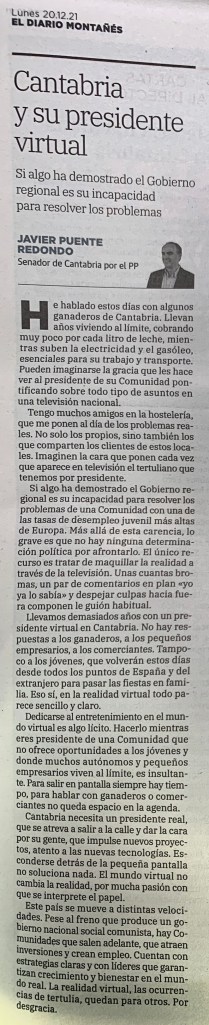 Cantabria necesita un presidente real, que se atreva a salir a la calle y dar la cara por su gente, que impulse nuevos proyectos, atento a las nuevas tecnologías. Esconderse detrás de la pequeña pantalla no soluciona nada. El mundo virtual no cambia la realidad, por mucha pasión con que se interprete el papel.