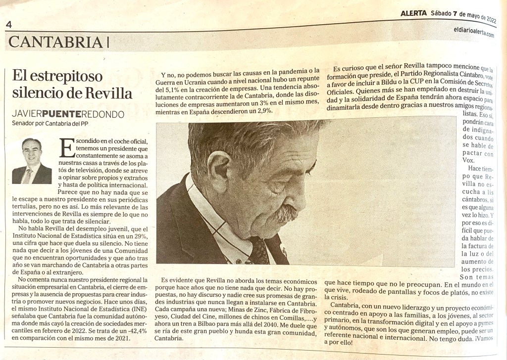 No comenta nunca nuestro presidente regional la situación empresarial en Cantabria, el cierre de empresas y la ausencia de propuestas para crear industria o promover nuevos negocios. Hace unos días, el mismo Instituto Nacional de Estadística (INE) señalaba que Cantabria fue la comunidad autónoma donde más cayó la creación de sociedades mercantiles en febrero de 2022. Se trata de un -42,4% en comparación con el mismo mes de 2021.