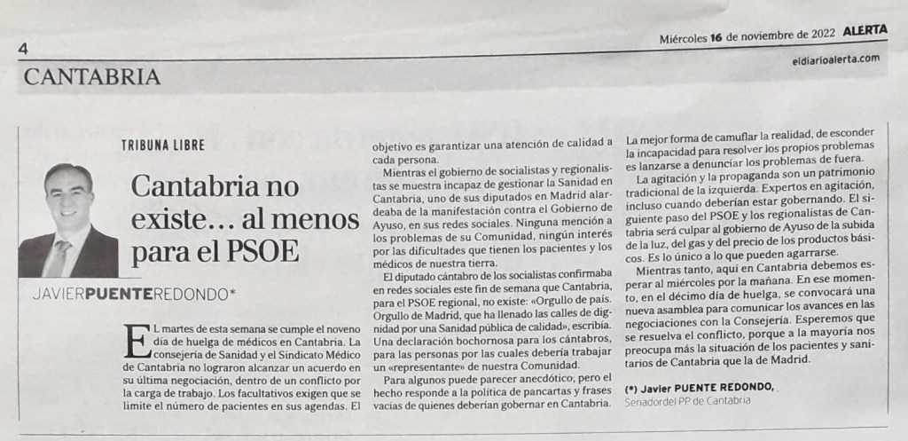Mientras el gobierno de socialistas y regionalistas se muestra incapaz de gestionar la Sanidad en Cantabria, uno de sus diputados en Madrid alardeaba de la manifestación contra el Gobierno de Ayuso, en sus redes sociales. Ninguna mención a los problemas de su Comunidad, ningún interés por las dificultades que tienen los pacientes y los médicos de nuestra tierra.